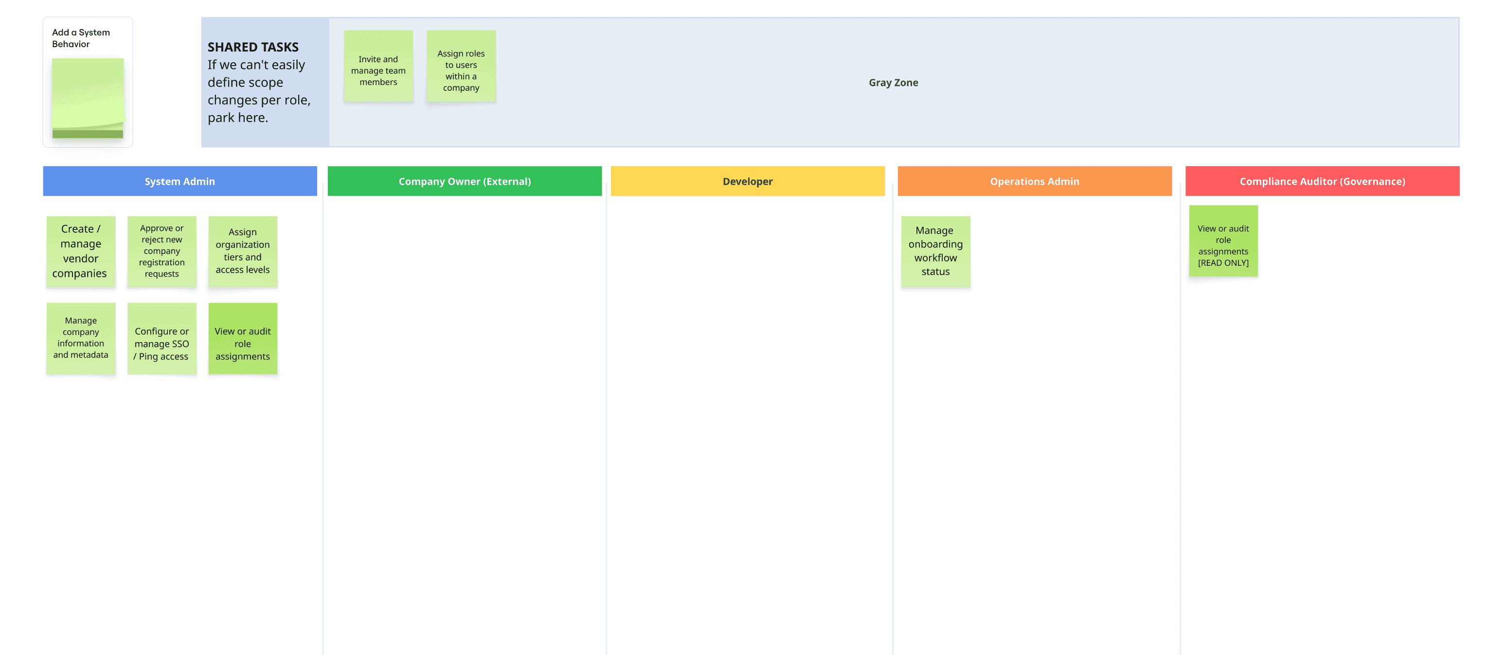 We started by validating the primary roles and identifying shared or overlapping actions between them. From there, we mapped system-level tasks to specific roles, highlighting areas that required shared access or governance alignment.