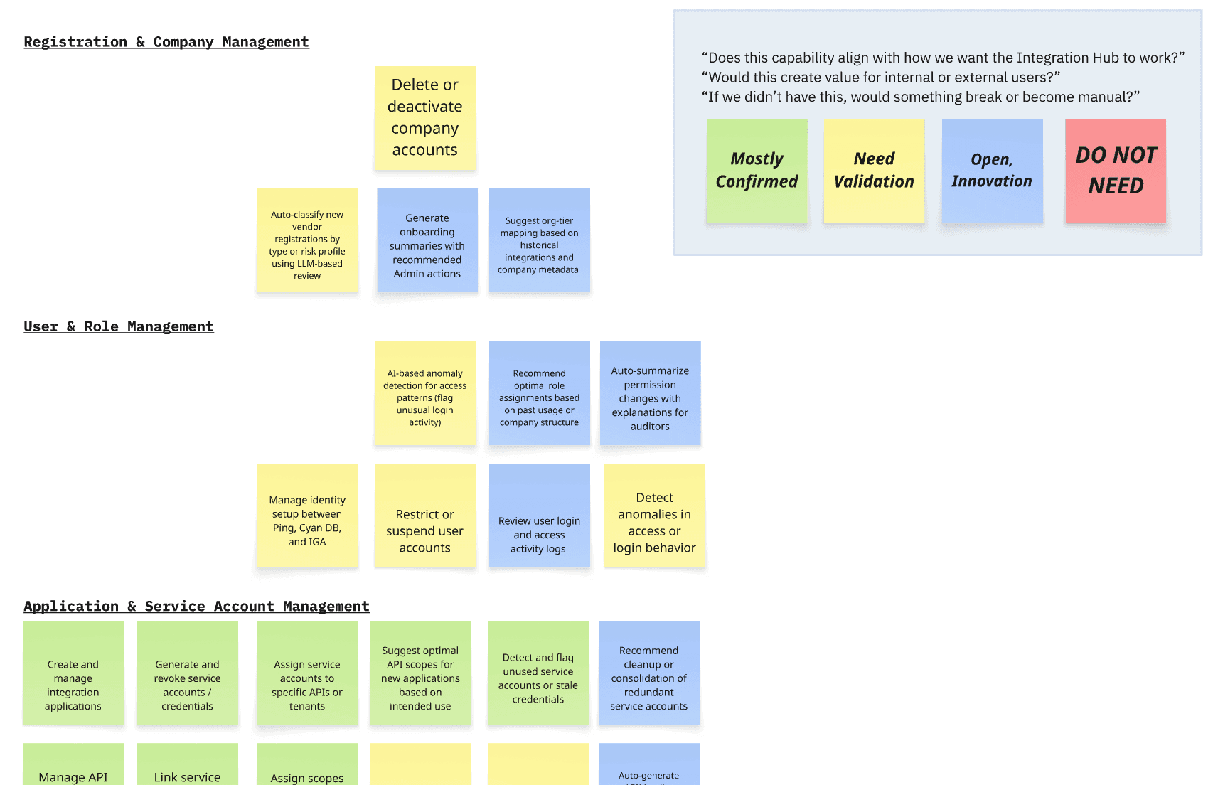 As part of defining the experience for the new Integration Hub, we ran a roles and permissions mapping exercise to clarify who can do what across the system. The goal was to translate business responsibilities and user needs into concrete system behaviors.